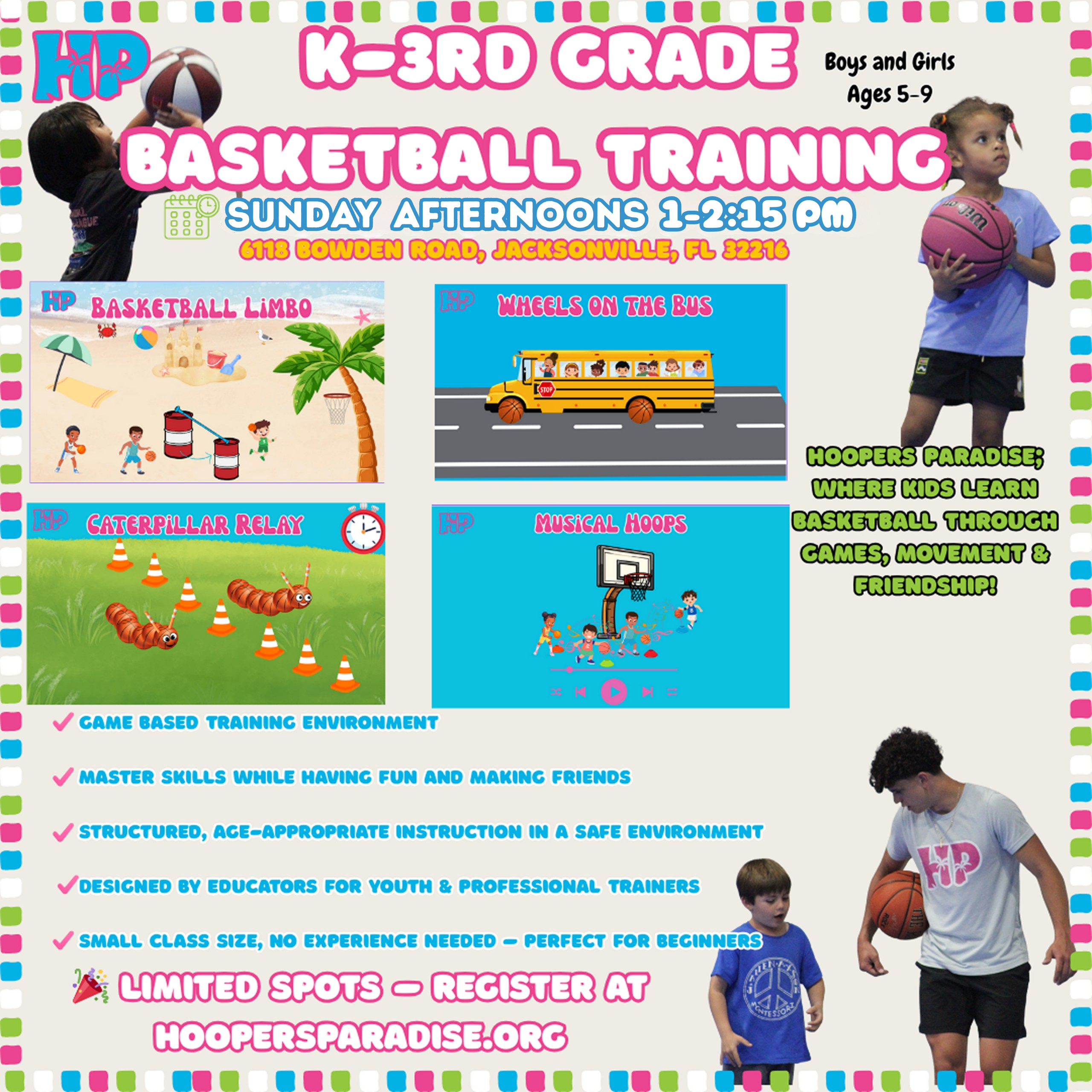 HOOPER’S PARADISE is a fun, engaging basketball program designed specifically for Kindergarten through 3rd grade athletes. Our game-based approach helps young players learn basketball fundamentals through movement, creativity, and play—while building confidence, friendships, and a love for the game.
